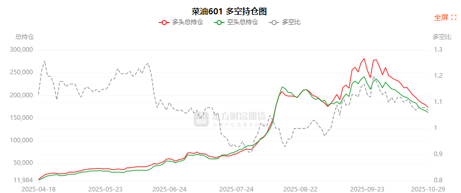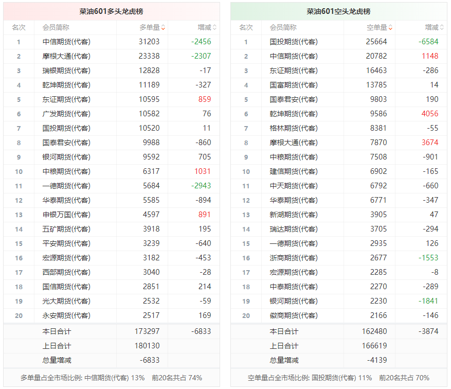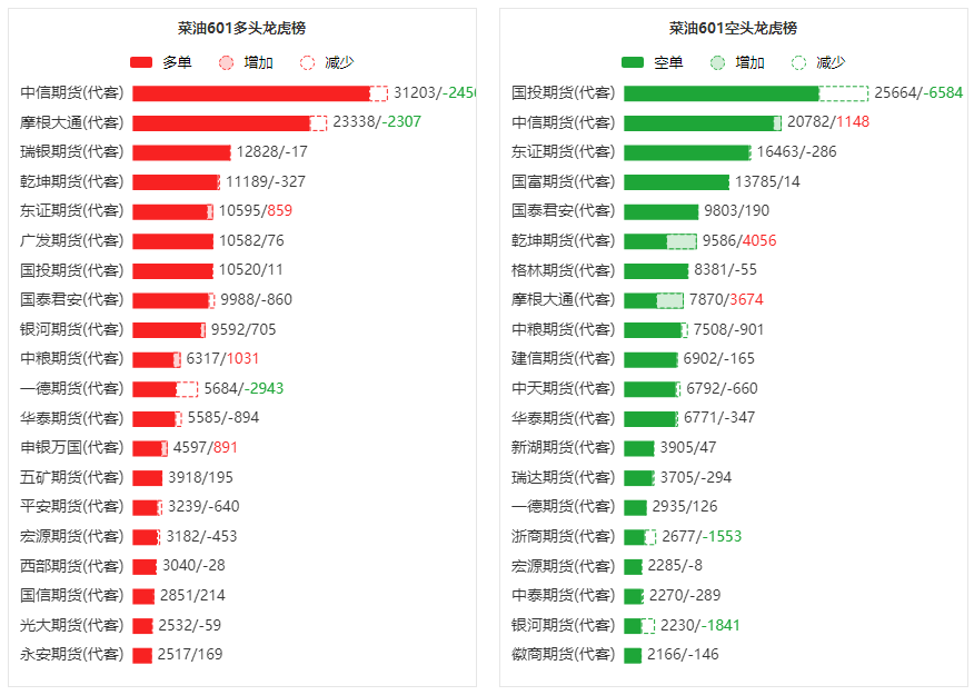 总体而言,菜油601合约今日减仓下行,多空持仓排名前20席中,多空双方均呈退场态势,多头退场意愿强于空头。